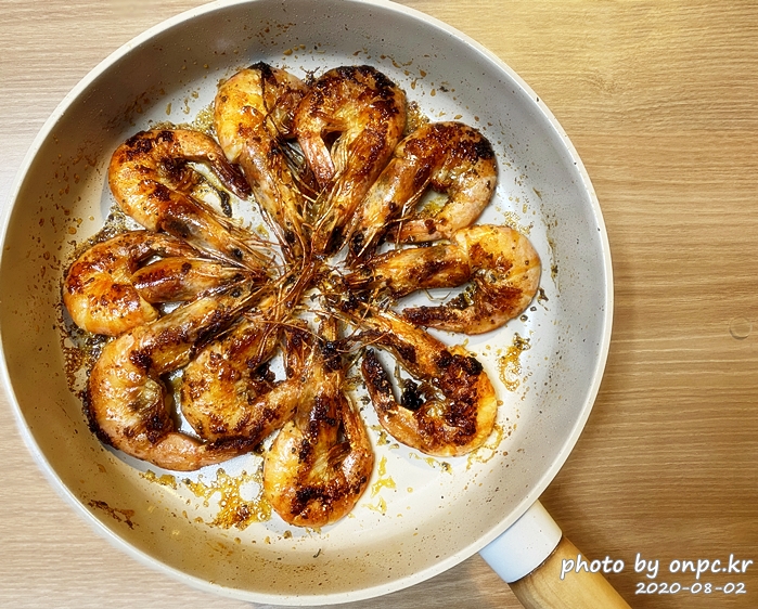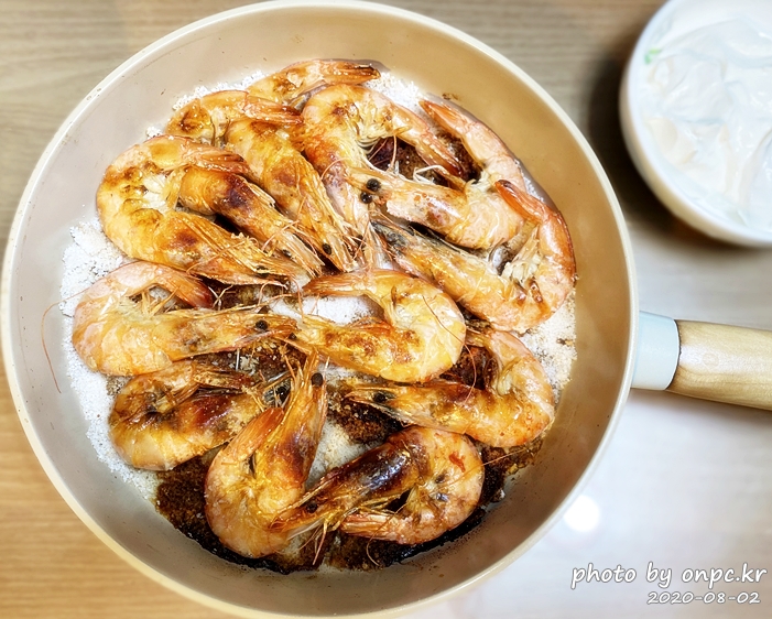 새우는 소금구이도 좋아요~ 프라이팬 바닥에 소금 깔고 새우 소금구이해봤어요.
