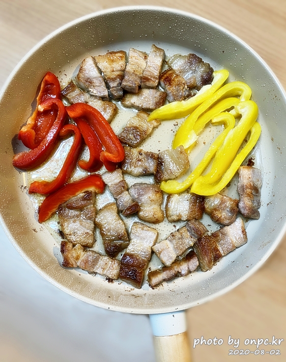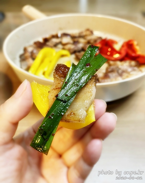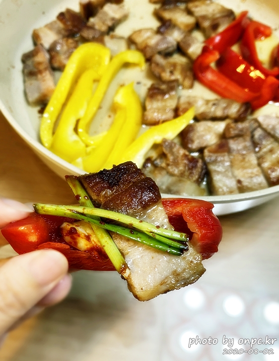 쌈 대신 생 파프리카에 삼겹살 얻어서 싸 먹으면 아삭함과 삼겹살이 잘 어우러져 식감도 좋고 맛있어요.