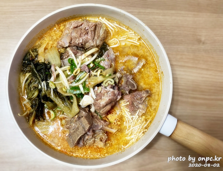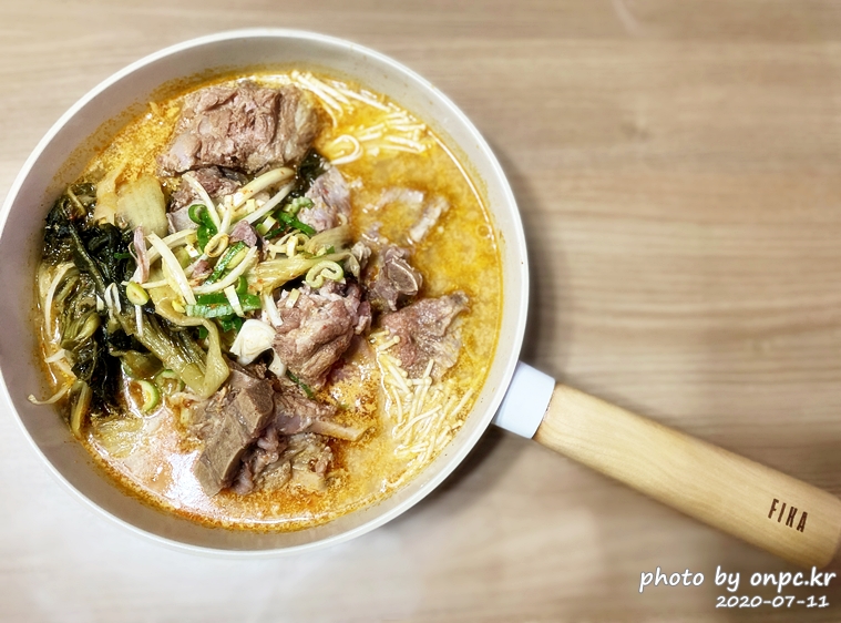 국물 있는 시래기 돼지등뼈 감자탕입니다. 감자탕은 프라이팬에서 데워먹었어요. 깊어서 국물 있는 음식도 거뜬해요~