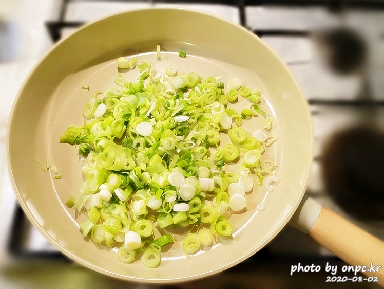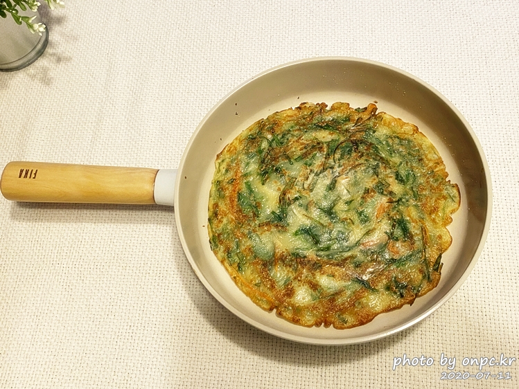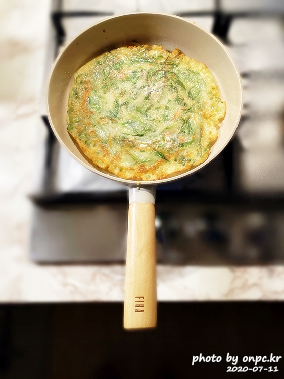 프라이팬 테스트를 위해서 처음으로 간단하게 지짐이를 부쳐봤어요.