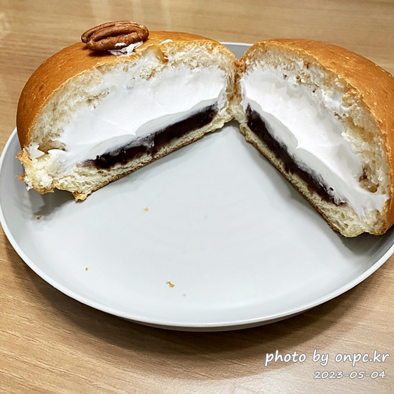 빵의 단면을 잘라보니! 팥 앙금과 부드러운 크림 꽉 차게 들어있어요.