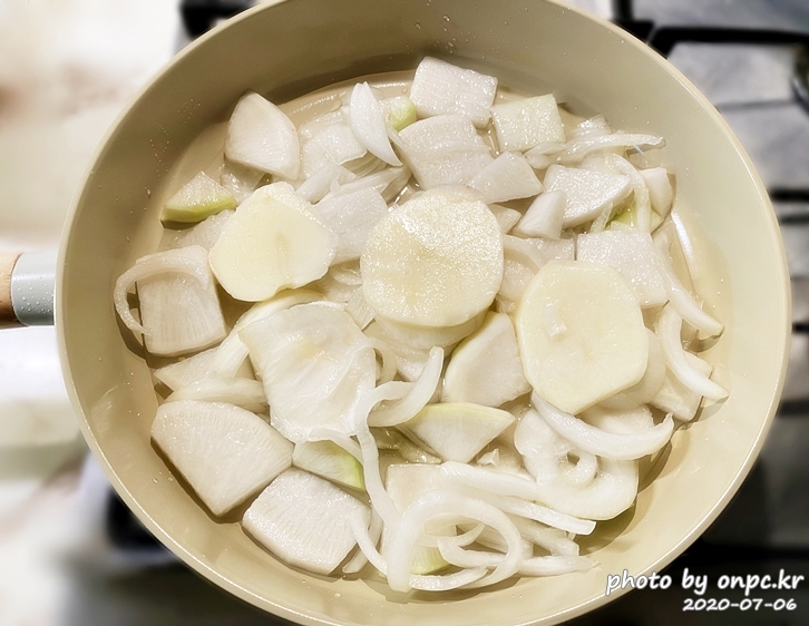 프라이팬에 물 130ml를 부어주고 양파, 감자, 무를 모두 깔아줬어요.