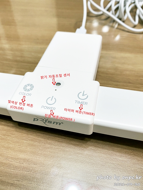전원 버튼(POWER ), 밝기 자동조절 센서, 빛 색상 변경 버튼(COLOR), 타이머 버튼(TIMER)