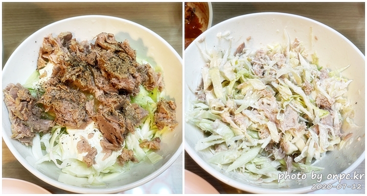 양배추, 참치, 후추, 아보카도 마요네즈에 올리브유 솔솔~ 뿌려서 샐러드 만들어서 닭볶음탕과 곁들여서 함께 먹었어요~