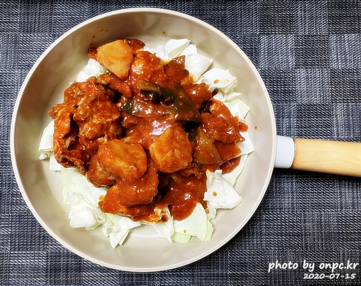 떡과 면 대신 양배추를 바닥에 깔아주고 닭볶음탕 한팩을 부었어요.