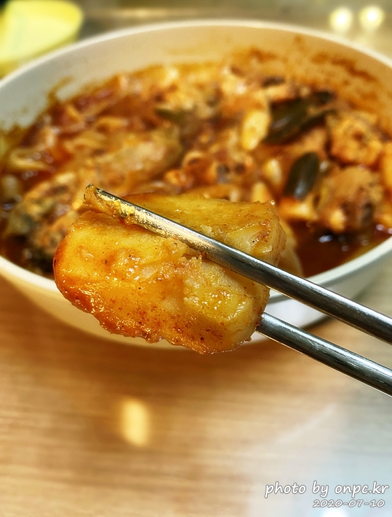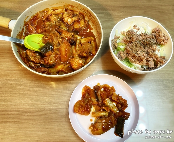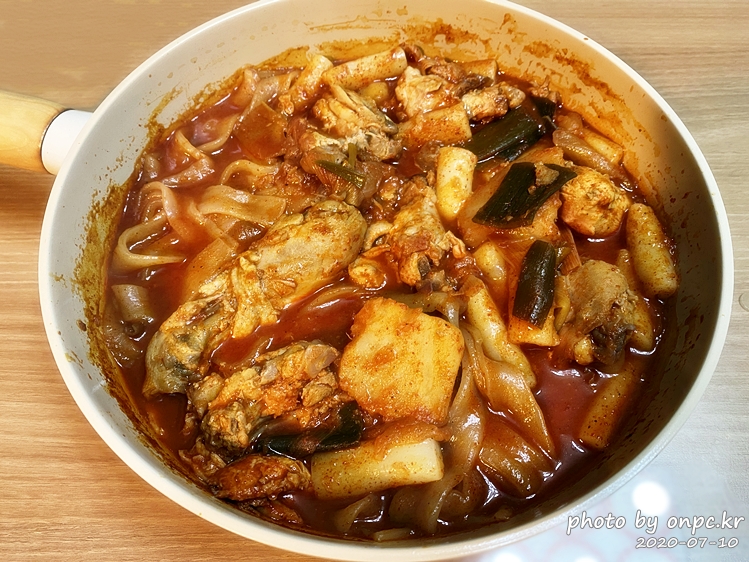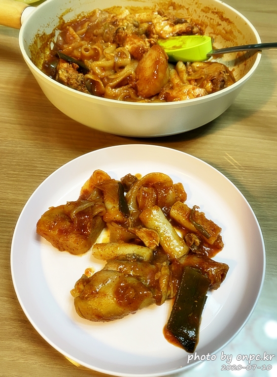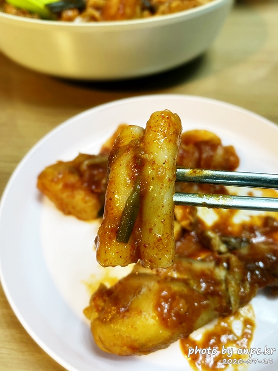 닭고기도~ 납작면도 맛있게 잘 익었어요. 매콤해 보이는 양념에 입맛 당기는 비주얼이에요.