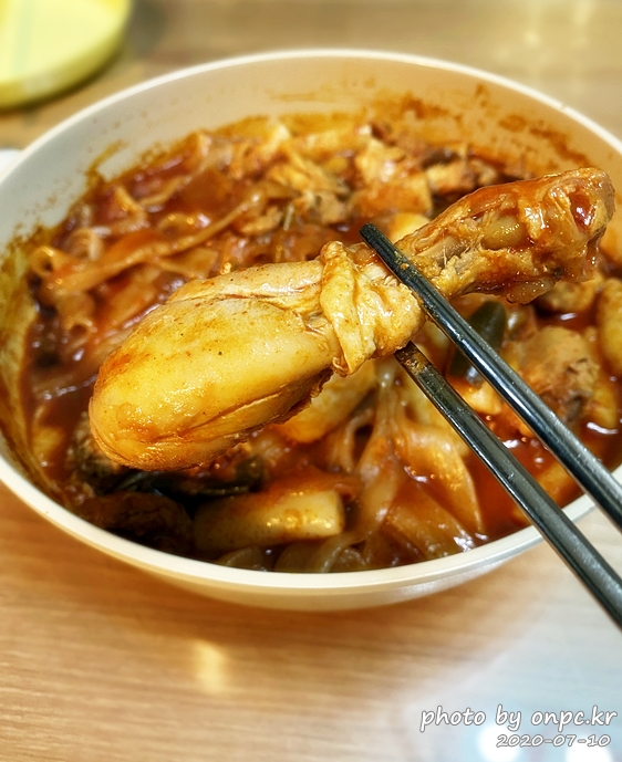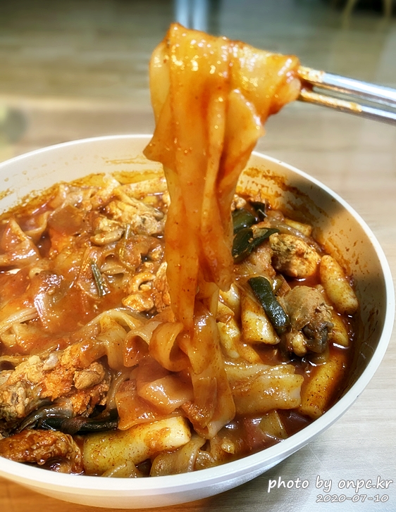 닭고기도~ 납작면도 맛있게 잘 익었어요. 매콤해 보이는 양념에 입맛 당기는 비주얼이에요.