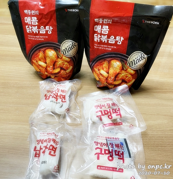 매콤 닭볶음탕 2팩(650g x2입), 납작면 50g x2입, 구멍떡 140g x2입.