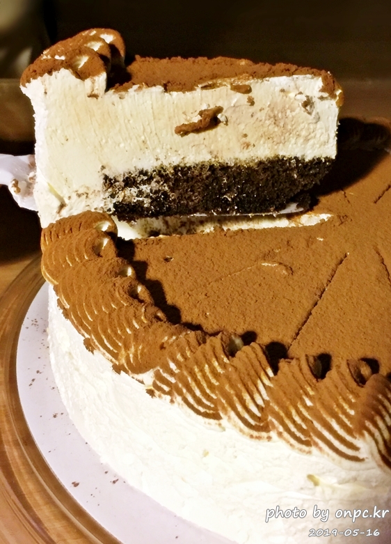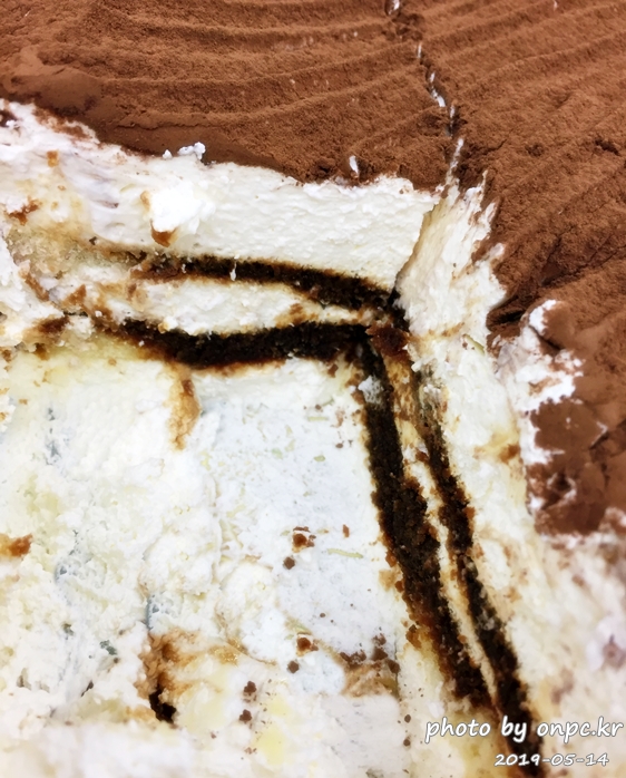 아래 촉촉한 커피 빵 시트가 깔려있고 위로 크림과 코코아 가루가 얻어진 부드러운 케이크~