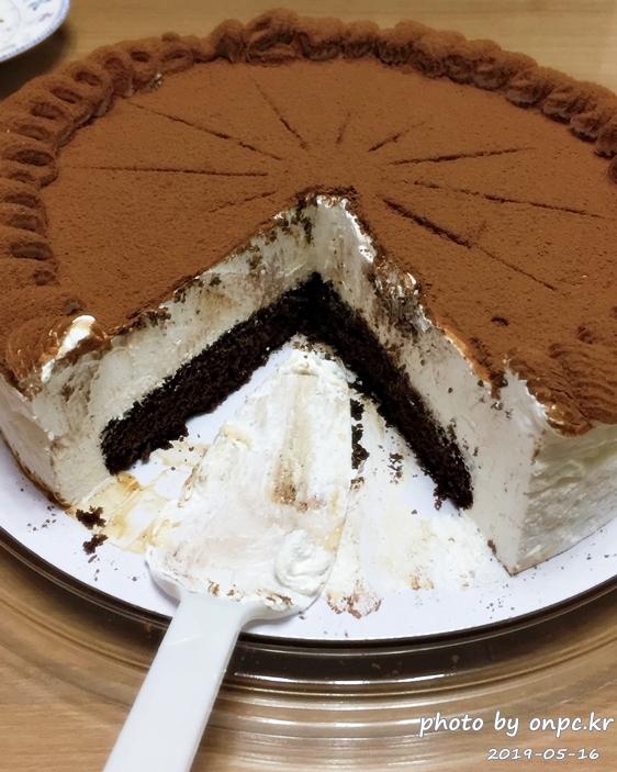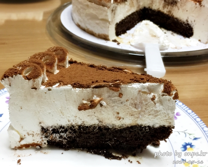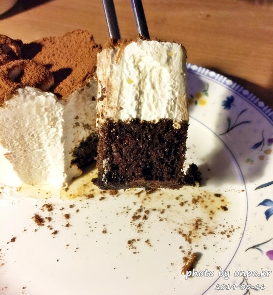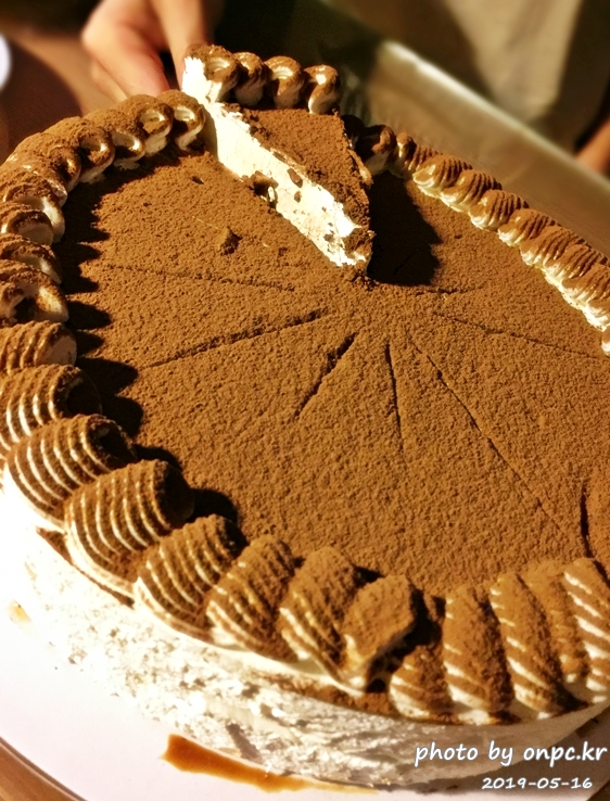 아래 촉촉한 커피 빵 시트가 깔려있고 위로 크림과 코코아 가루가 얻어진 부드러운 케이크~