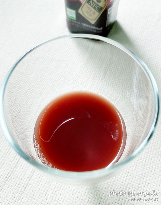 완전 진한 붉은색은 아니고 살짝 연한 빛을 띠고 있어요. 토마토 주스 정도의 색이랄까요?