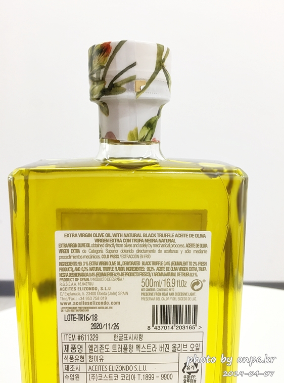 엑스트라 버진 올리브유로 품질은 좋으나 트러플 향은 일부러 향을 맡으려고 애써봐도 음.. 향이 나질 않네요.