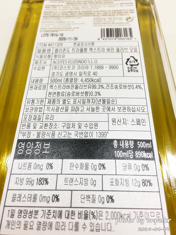 엑스트라 버진 올리브유로 품질은 좋으나 트러플 향은 일부러 향을 맡으려고 애써봐도 음.. 향이 나질 않네요.