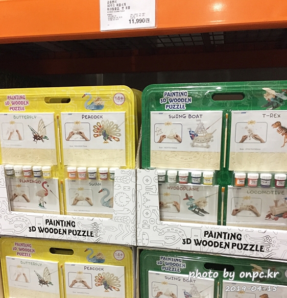 금홍 팬시 3D 우드 퍼즐 4개, 아크릴 물감, 붓 포함(PAINTING 3D WOODEN PUZZLE). 가격은 11,990원
