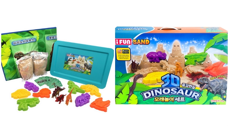 공룡세트: 아이펀샌드 2개, 공룡 피겨 3종, 공룡 화석 틀 4종, 공룡 모양 틀 4종, 놀이겸용 보관케이스, 3D체험카드 10매..