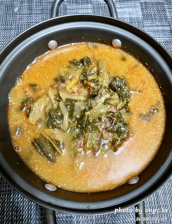 국물보다 건더기가 많은데 물을 조금 더 넣어서 끓여주면 간도 맞고 국물도 많아져서 괜찮은거 같아요.