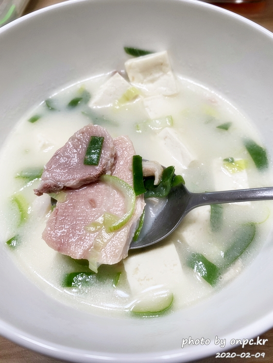 새해 첫날 떡국대신 떡국 분위기가 나게 돼지국밥에 두부와 대파 넣고 커스텀 해봤습니다.