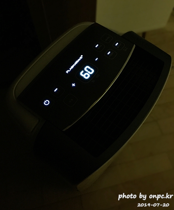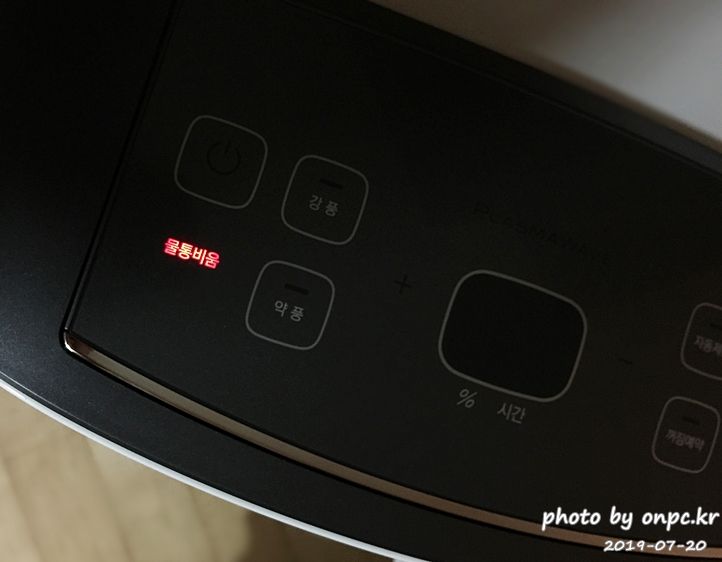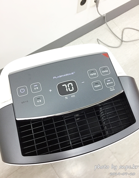 위 사진에는 약풍, 자동 제습, 플라즈마, 습도 표시등에 불이 들어와 있어요.
