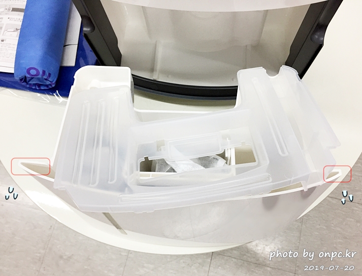 물통을 빼 봅니다. 옆면을 잡고 앞으로 당기면 빠집니다.