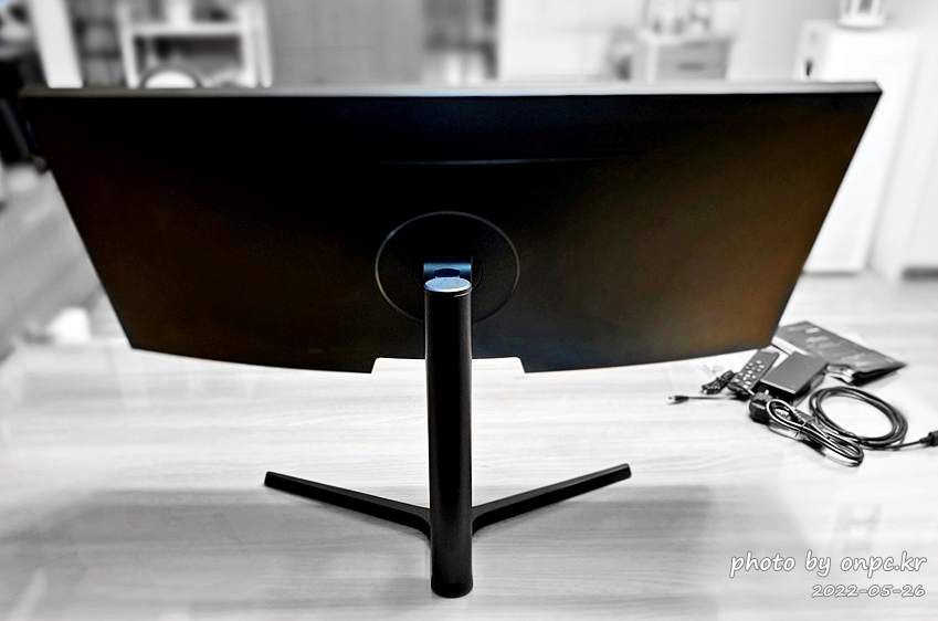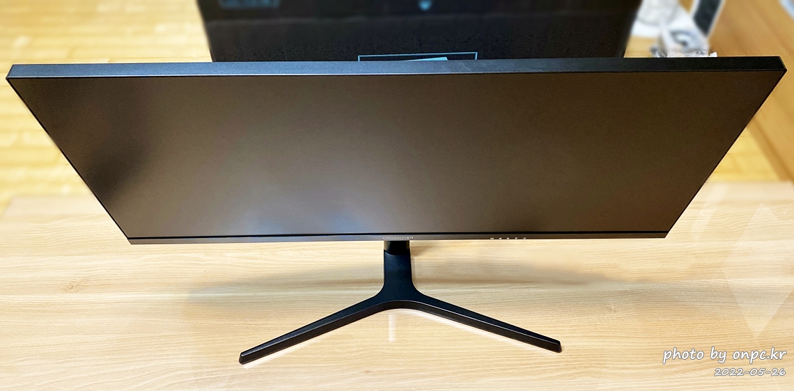 모니터 받침대와 슬림 베젤 적용 모니터로 전체적인 디자인이 깔끔해요. 시원하게 큰 와이드 화면이 맘에 들어요~