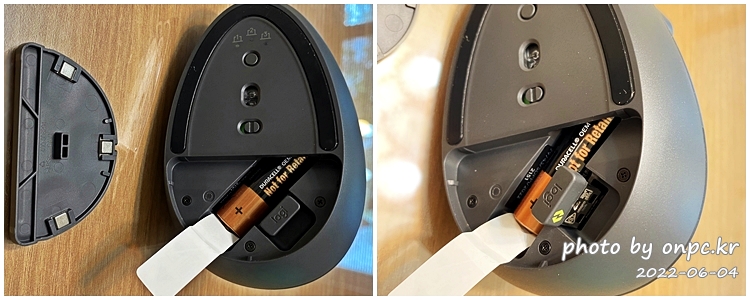 마우스 바닥 덮개를 오픈하면 AA 배터리 한 개와 Logi Bolt USB 수신기가 들어있어요.