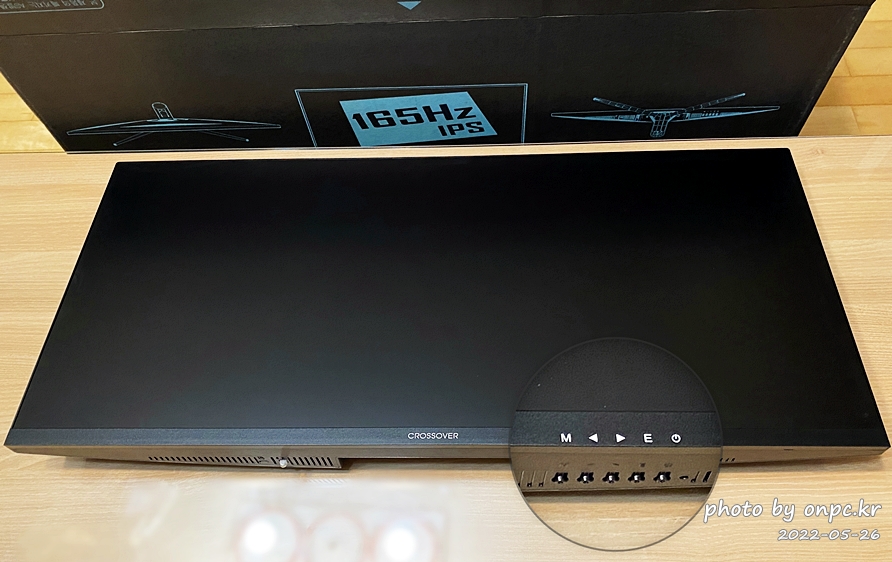 우측 하단에 OSD 버튼이 위치해 있어요.(M(메뉴), UP/DOWN, E(입력 소스), 전원)