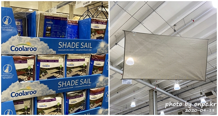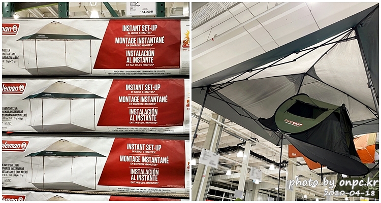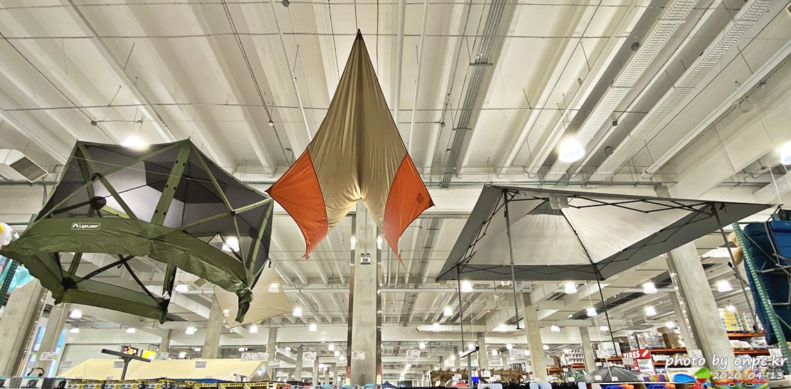 코스트코 매장 캠핑용품 코너 천장에는 스크린 텐트, 타프, 쉘터, 그늘막 등이 펼진 상태로 진열되어 있어요~