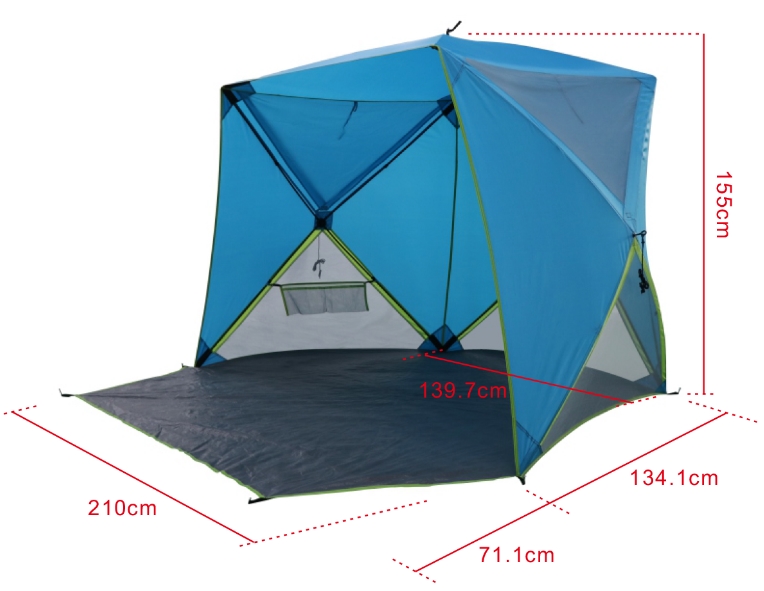 둥근형태의 그늘막 / 4개의 허브형 디자인으로 손쉬운 설치 가능 / 3개의 통풍구와 2개 창문