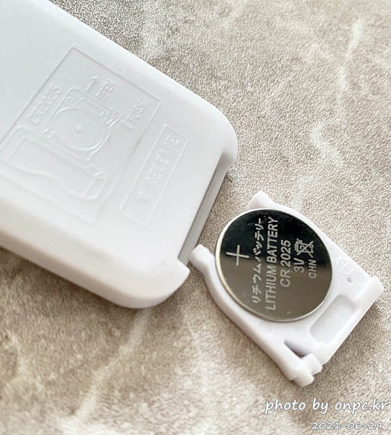 리모컨 하단 부분에 손으로 잡고 빼보면 원형의 납작한 CR 2025 3V 리튬 배터리 1개가 들어있어요~