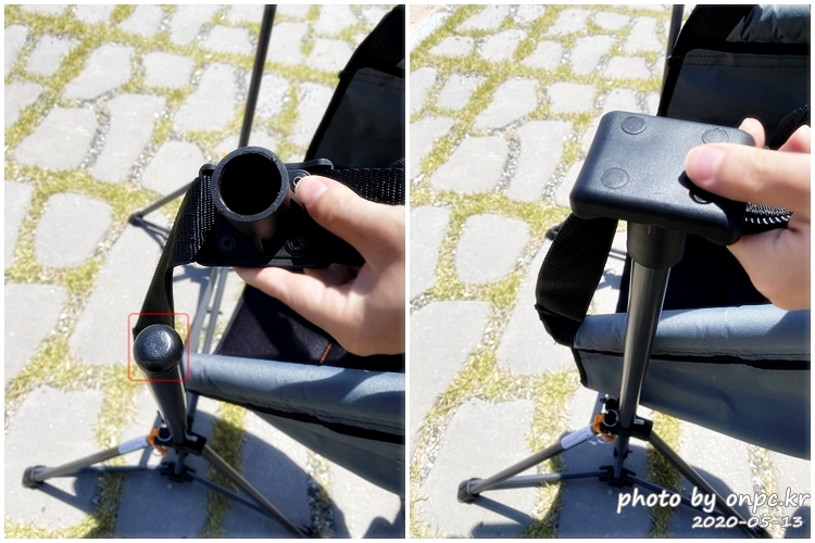 의자 본체에 붙어 있는 검은색 플라스틱 버클을 위 사진처럼 양쪽 다리에 끼워줍니다.