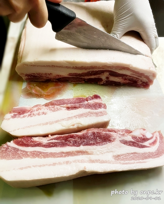 5kg 냉동 삼겹살 해동 후 자르기~!!