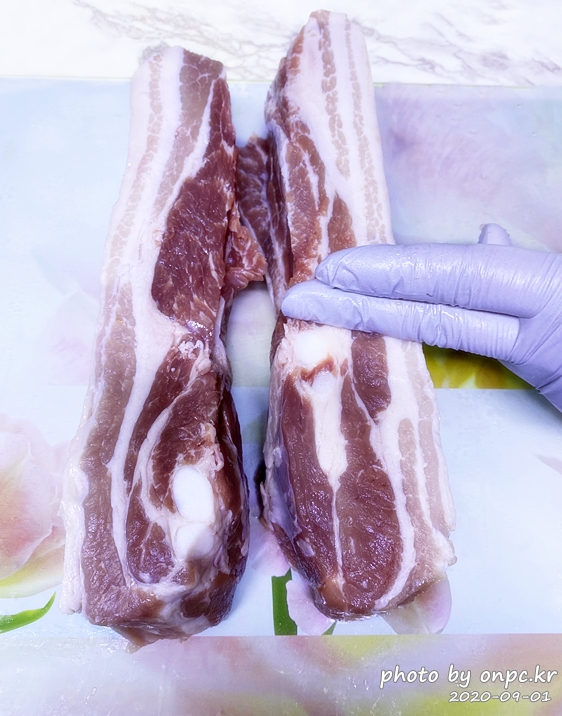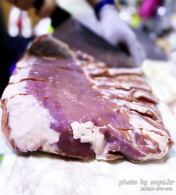실제로 보고 만져보면 고기 빛깔도 좋고 탄력도 좋아요. 맛있는 좋은 삼겹살입니다.