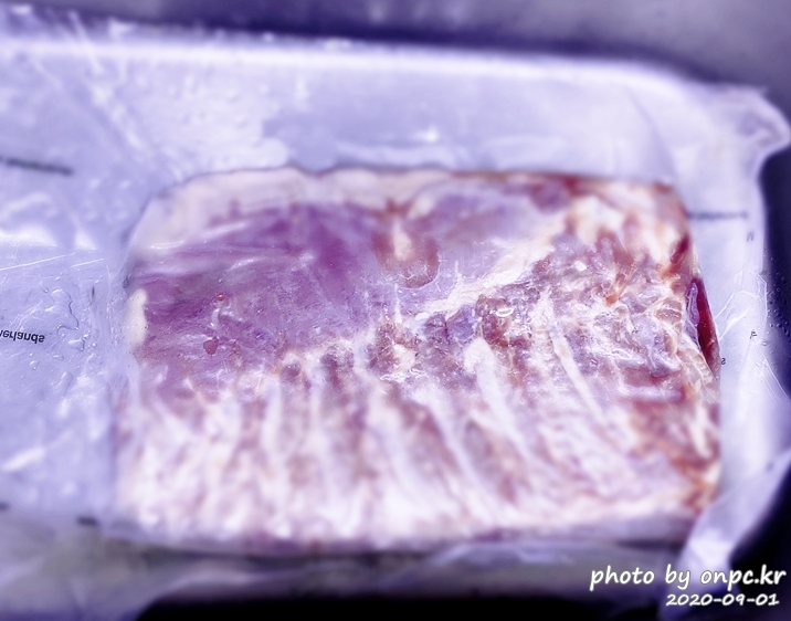 3.7kg 냉동 삼겹살을 해동한 상태입니다. 우측 비닐 안에 핏물 고여있는 게 보이네요.
