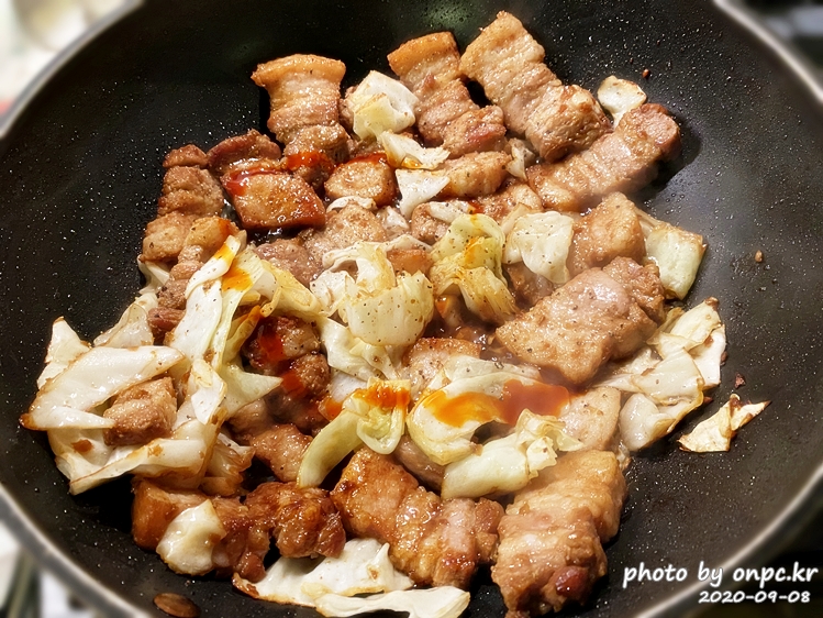 통 삼겹살을 먼저 굽고 한입 크기로 자른 후 양배추와 함께 볶아줬어요.