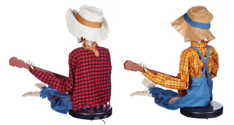 시골풍 의상을 입고 미국 현악기 밴조를 든 한 쌍의 해골 인형이다.