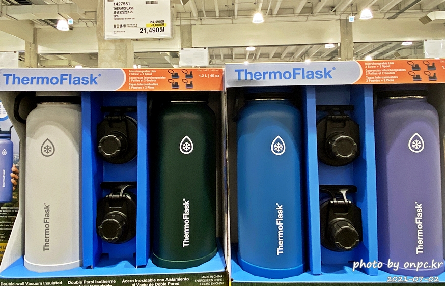 브랜드: 써모플라스크 / 용량 및 구성: 1.2L 2개 세트, 뚜껑 2종류 / 색상구성: 그린&화이트, 블루&퍼플