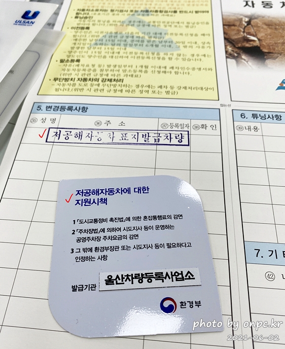 자동차 등록증 변경등록 사항에는 '저공해자동차 표지 발급 차량' 스탬프가 찍히고 스티커를 발급해줍니다.