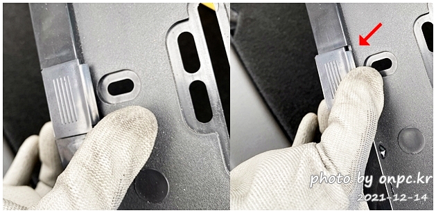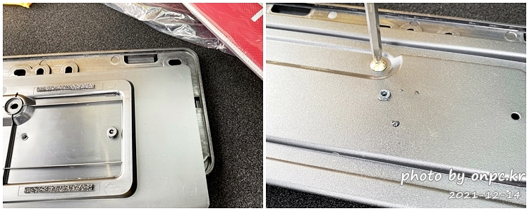 오른쪽은 기존 나사 구멍 위치와 딱 맞아떨어지네요. 그대로 사용하면 됩니다. 하지만 왼쪽은 가드에 가려서 보이지 않아요.