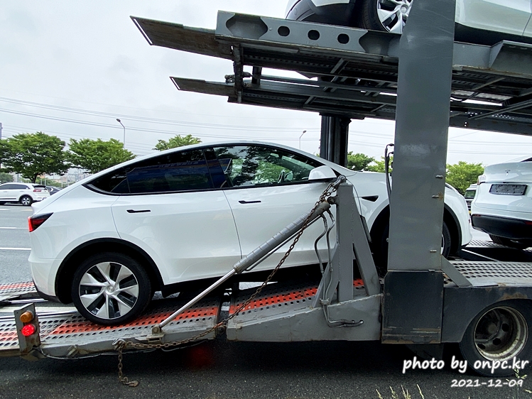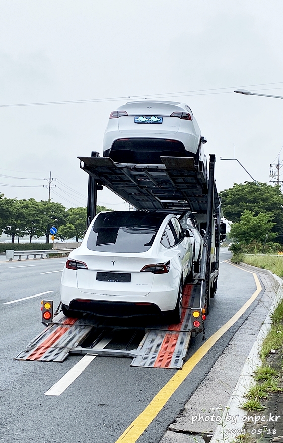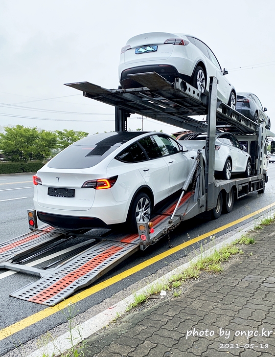 탁송차에는 모델 Y 3대와 모델 3 1대가 실려있어요~ 미리 대행업체에서 번호판까지 부착한 차도 보이네요.