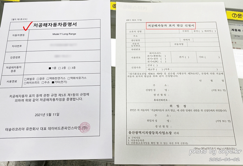 테슬라에서 보내준 서류 중 저공해 자동차 증명서와 함께 신청서를 작성 후 신분증과 접수하면 됩니다.