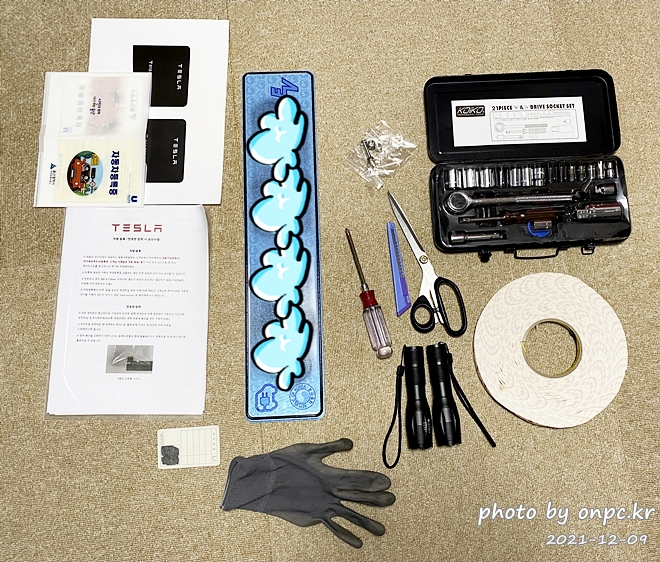 자동차등록증, 신분증, 번호판, 번호판 부착에 필요한 장갑과 공구들. 혹시 몰라 전날에 미리 많이 준비했어요.