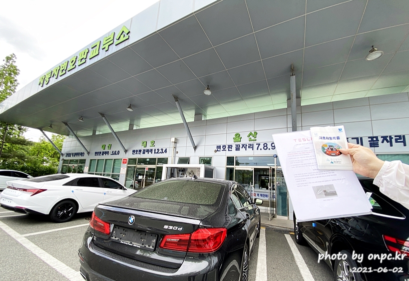 필요한 주민등록등본, 보험가입증명서, 등기로 받은 서류들을 챙겨서 차량등록사업소를 방문합니다.