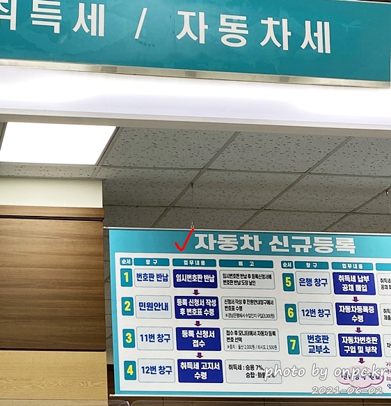 ① 차량등록사업소 방문-> ② 신규등록 신청서 접수-> ③ 정부 수입인지 구매-> ④ 취득세 고지서 수령 후 납부