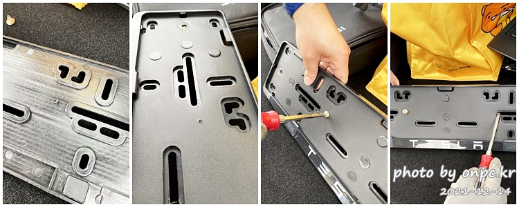 번호판을 장착할 땐 위쪽부터 튀어나온 홈에 맞춰 끼운 후 좌우와 아랫부분을 고정해주면 됩니다.