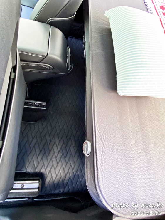 1열 좌석을 앞으로 당기지 않았을 때 평소 주행할 때의 모습이에요. 매트가 1열 좌석 뒤까지 오는 걸 볼 수 있어요.