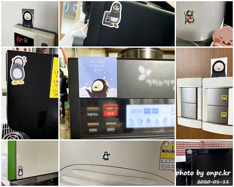 보일러 조절기 위, 스피커 옆, 스위치, 주방, 냉장고, 문, 에어컨, 모니커, 커피머신에도 온통 펭수 스티커를 붙였어요.
