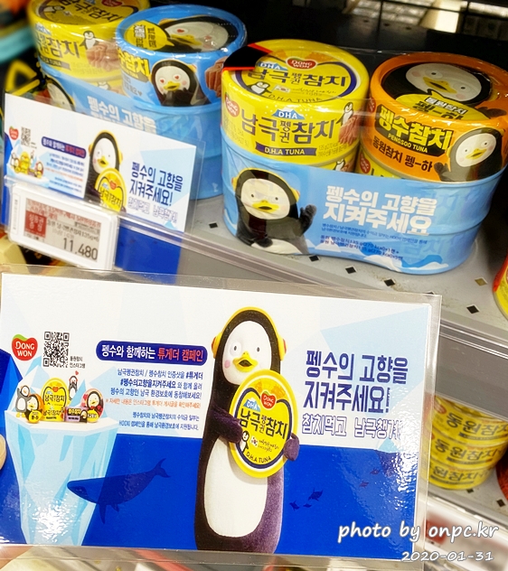 동원 로고 옆에 펭수참치(PENGSOO TUNA)라고 새겨져 있네요.