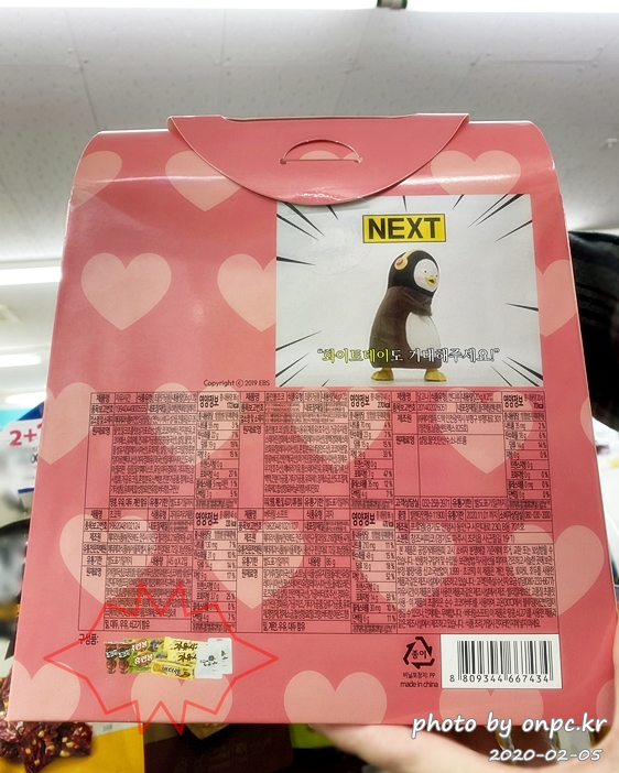 귀여운 펭수로 디자인된 세트의 상자를 구매하면 안에 초콜릿, 스낵, 에너지바 등이 들어있고