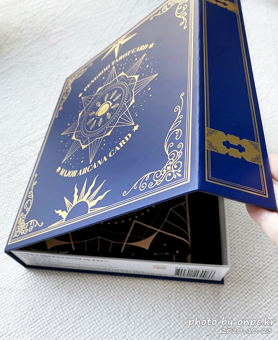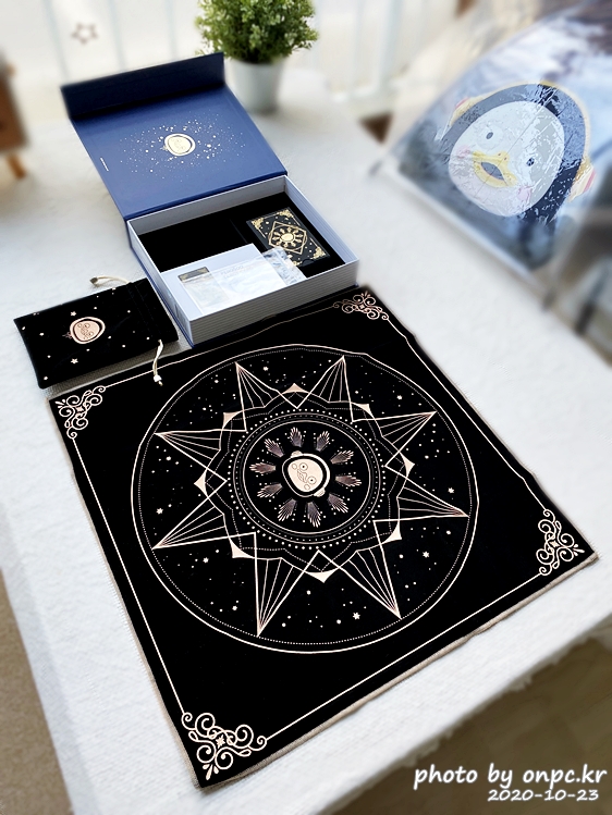 바닥에 타로 천을 깔아주고~ 종이 케이스에 들어있는 타로 카드를 꺼내보아요.