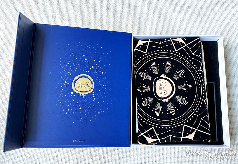 왼쪽에 별이 반짝이는 우주의 공간의 신빈한 기운을 받고 있는 펭수와 오른쪽의 구성품 모습이에요.